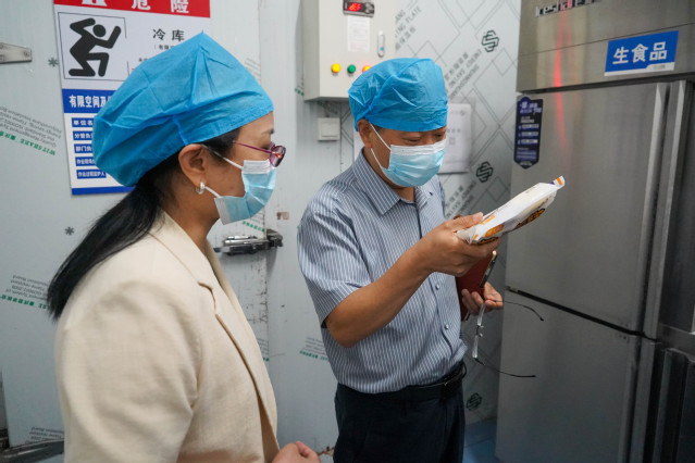 邓明国一行深入大学城校区第一食堂A区后厨,通过“一看、二问、三查”的方式,对食堂食品的采购、储存、加工、留样及餐具消毒等环节进行了细致检查,全面了解食堂食品安全主体责任落实情况。
