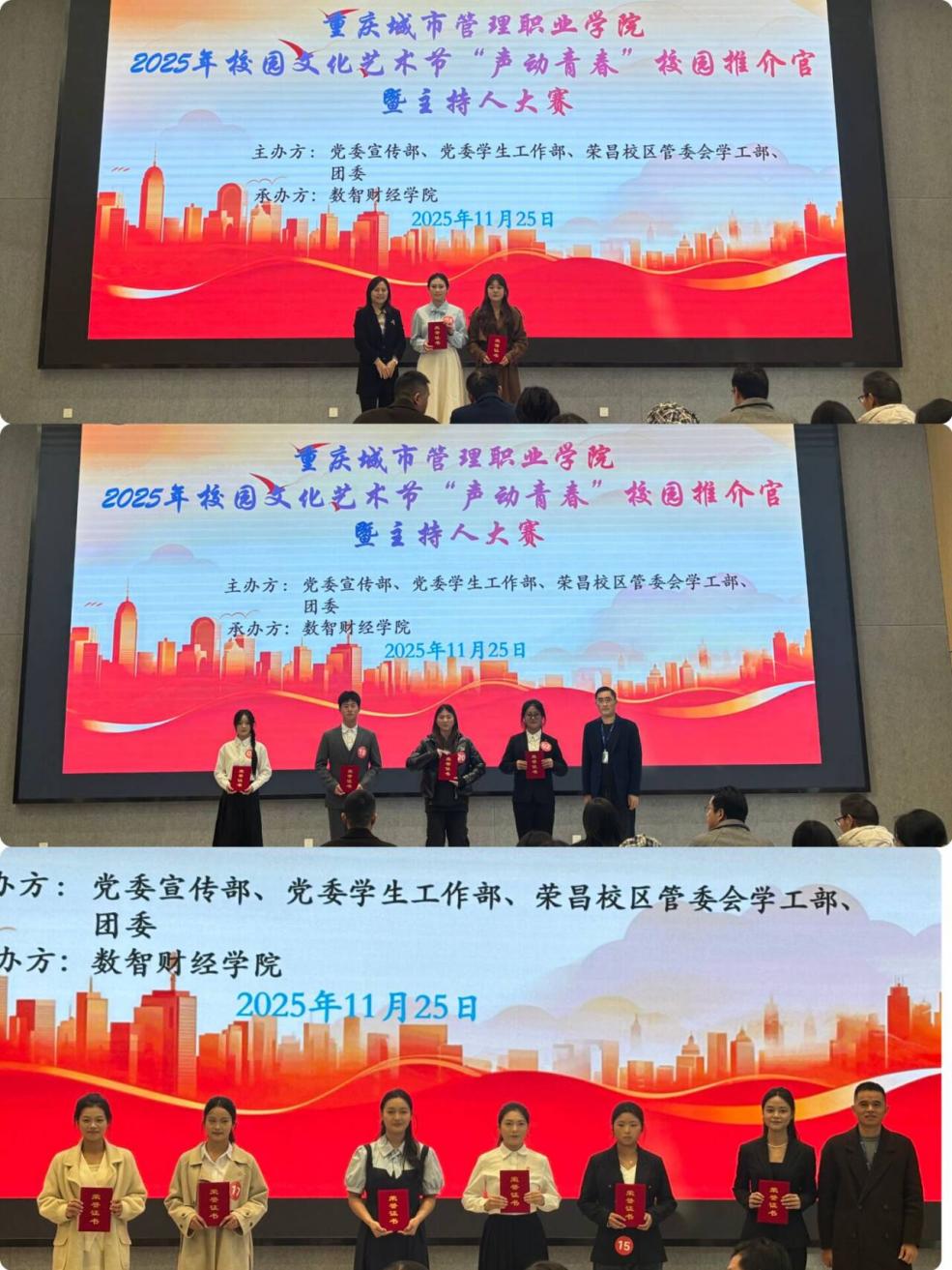 11月25日、12月3日,由党委宣传部、党委学生工作部、荣昌校区管委会学工部、校团委主办,数智财经学院承办的2025年校园文化艺术节“声动青春”校园推介官暨主持人大赛决赛成功举办。