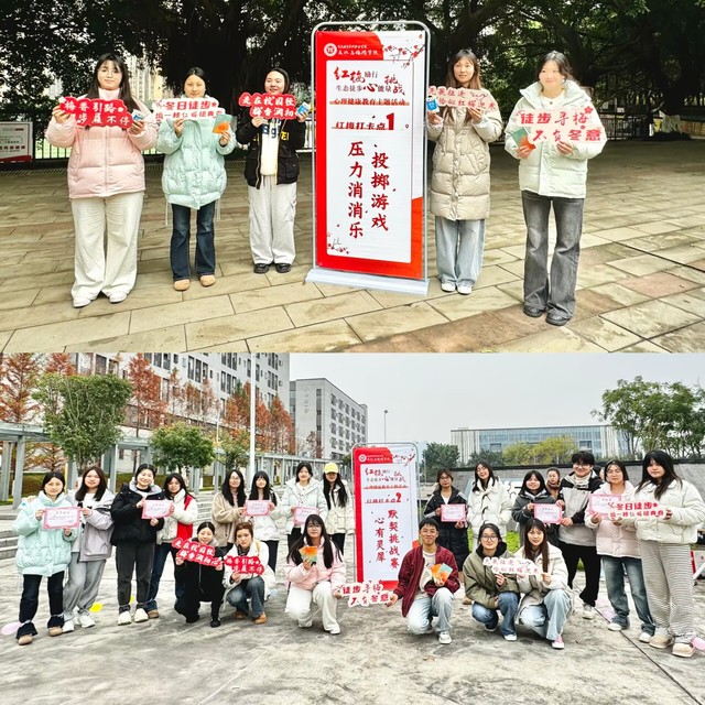全体师生沿着“运动场 - 睿德广场 - 小礼堂 - 第二食堂 - 滑板广场”的生态线路有序前行,以“校园徒步”为核心载体,完成两大区域打卡心能量挑战任务。在红梅打卡点 1,“压力消消乐”投掷游戏热烈开展,同学们通过趣味投掷释放心理压力,获胜者获得红梅主题小礼品;在红梅打卡点 2,“心有灵犀”默契挑战赛温馨上演,师生之间、同学之间的默契配合拉近了心理距离,获胜者领取能量零食补给。活动末尾,学院为顺利完成全程徒步挑战的师生颁发“红梅励行挑战者”证书,见证大家的坚持与成长。