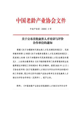 近日,中国老龄产业协会公布了首批康养人才培训与评价合作单位名单,我校成功入选。本次遴选工作依据《关于加强新时代高技能人才队伍建设的意见》《关于加强养老服务人才队伍建设的意见》等相关政策文件开展,旨在推动康养服务领域专业技能人才队伍建设。
