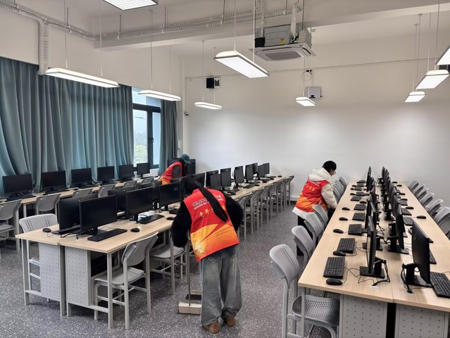 在荣昌校区教学楼,志愿者们分组行动,手持扫帚、抹布、水桶等工具,对教室地面、门窗玻璃、课桌椅等进行全方位清洁:有的弯腰细致捡拾角落杂物,有的踮脚擦拭高处窗框,有的合力整理课桌椅摆放秩序,不放过任何卫生死角,用耐心和细心为师生打造整洁明亮的教学环境。大学城校区商学院应用实训中心内也是一派热火朝天的劳动景象。志愿者们小心翼翼擦拭实训设备表面的灰尘,仔细清理操作台缝隙的杂物,有序整理实训工具与耗材,确保实训中心以崭新面貌迎接新学期教学工作。本次志愿服务活动负责人关贸A2401班学生刘淋淋谈到:“实训中心是我们专业学习的重要场所,干净整洁的实习环境是有效学习的基础。同学们分工协作、互帮互助,不怕脏、不怕累,用汗水诠释奉献内涵,既践行了劳动精神,也增强了责任感和归属感。”