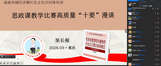 为深入贯彻落实立德树人根本任务,进一步提升思政课教师的教学竞赛能力与课堂育人水平,推动新时代思政课改革创新提质增效,3月10日,由成渝地区双城经济圈红色文化教育共同体主办,重庆城市管理职业学院和乐山职业技术学院共同承办,教育部高校思想政治工作创新发展中心(重庆城市管理职业学院)、教育部大中小学思政课一体化共同体(重庆)、教育部职业学校思政课建设协作组(重庆)、重庆市大中小学思政课一体化建设共同体(沙坪坝区)(荣昌区)、重庆高校思想政治工作队伍培训研修基地暨高职高专院校思想政治工作创新发展中心协办的思政课教学比赛专题线上培训顺利举行。培训会由我校马克思主义学院院长杨飏主持。