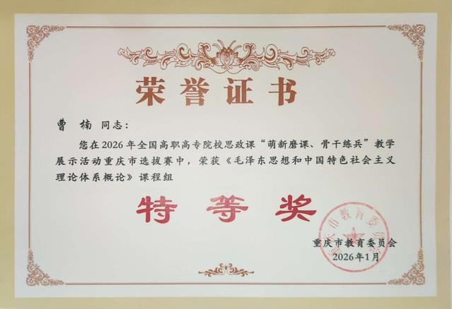为深入贯彻党的二十届四中全会精神和习近平总书记对学校思政课建设作出的最新重要指示,持续推进思政课教师队伍内涵式发展,不断提升思政课教学质量和育人实效,近日,由重庆市教育委员会主办的2026年全国高职高专院校思政课“萌新磨课、骨干练兵”教学展示活动重庆市选拔赛圆满落幕。我校马克思主义学院2名参赛教师在此次比赛中表现优异,斩获佳绩。