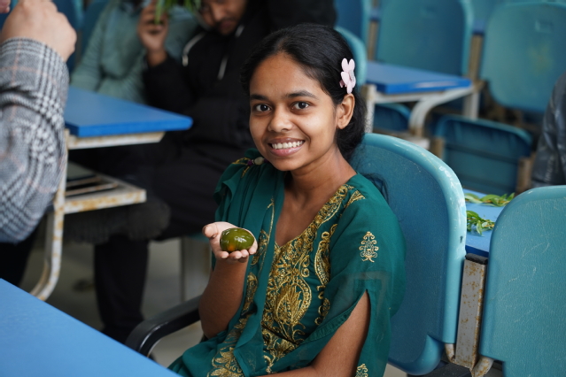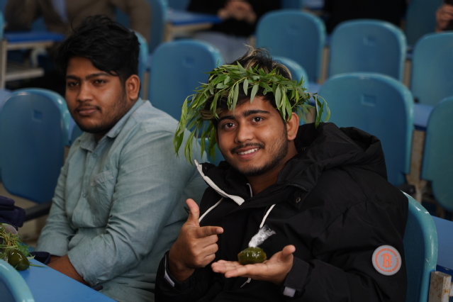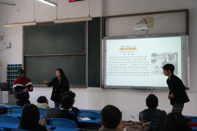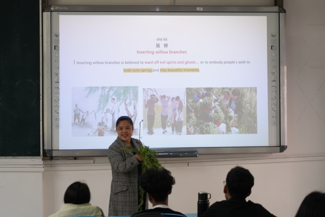 在传统文化分享阶段,邓春梅以“走近清明 感悟传统”为题,分享了清明节的由来、历史典故以及节日习俗等传统文化知识,并现场指导留学生代表演示清明插柳的节日习俗。在经典诗词赏析阶段,伏斐赏析并诵读唐朝诗人杜牧的作品《清明》;龚渝婷与老挝留学生阿龙和孟加拉国留学生王旭一起诵读北宋教育家、诗人程颢的代表作《郊行即事》;蔡德都和牟莉共同诵读明朝文学家、诗人瞿佑的代表作《清明即事》。最后,王娟带领全体师生诵读了南宋著名诗人陆游的佳作《春日》。伴随着悠扬的中国古典音乐,老师们为留学生逐一分发清明传统糕点—青团,大家在品尝中华美食、感受中国传统文化的过程中纷纷相约“走进春天,拥抱自然”。