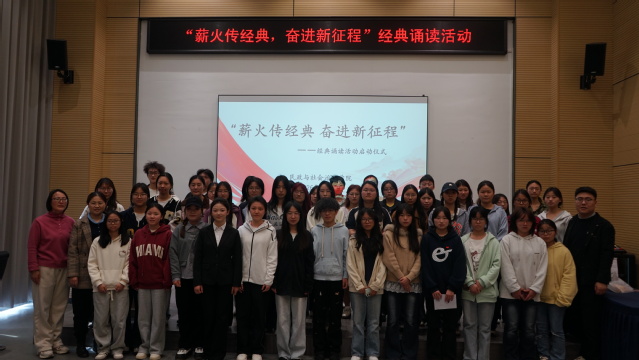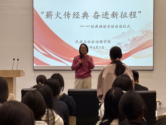 为传承中华优秀传统文化,厚植青年学生文化底蕴,以经典智慧浸润心灵、赋能成长,扎实推进学院文化育人工作走深走实,4月10日,民政与社会治理学院“薪火传经典 奋进新征程”经典诵读活动启动仪式在荣昌校区活动中心举行。学院党总支副书记李国英、辅导员与学院学子齐聚一堂,共同开启品读经典、传承文脉、涵养身心的文化之旅。