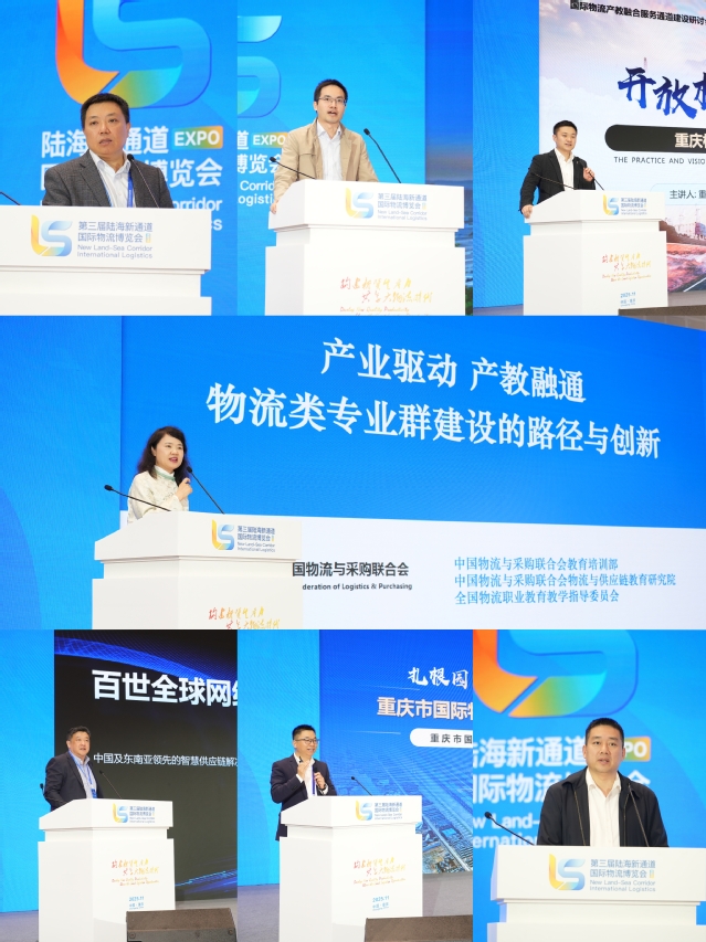 大会第二阶段为国际物流产教融合服务通道建设研讨会。7位专家依次分享主题报告。中国物流与采购联合会教育培训部副主任张晓梅分享《产业驱动,产教融通 物流类高水平专业群建设的路径与创新》,重庆市政府口岸物流办产业处副处长王仕军分享《开放枢纽·产业引擎:重庆枢纽与产业融合发展的实践与愿景》,重庆国际物流枢纽园区招商引资二部部长周金亮分享《陆港枢纽·开放高地:国际物流枢纽园区的建设路径与产业集聚》,重庆工商大学教授、博导张军分享《通道赋能·融合发展:西部陆海新通道创新驱动国际物流产业链转型发展分析》,广西职业技术学院物流学院院长吴砚峰分享《面向东盟,协同发展:“职教出海”的广职院模式与实践》,百世集团高级副总裁特助、院校合作部总经理李东分享《全球化布局与本土化赋能:百世集团产教融合的海外实践》,我校商学院副院长邱云分享《园行企校·协同育人:重庆市国际物流产教联合体建设模式与实践探索》。会场气氛热烈,与会院校、企业代表就如何推动国际物流产教联合通道建设,完善多元化、多层次、全方位的现代物流和供应链专业人才培养体系等主题深入交流、相互探讨。