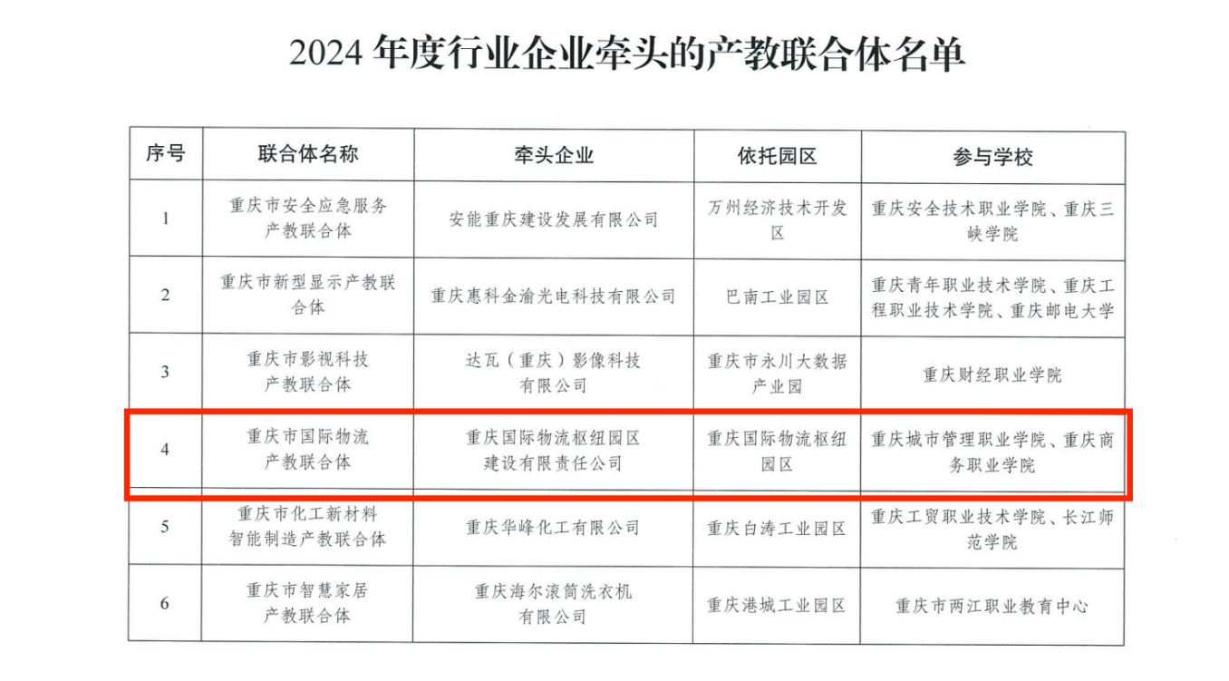 近日,重庆市经济和信息化委员会、重庆市教育委员会联合发布《关于公布2024年度市域产教联合体名单的通知》,我校牵头组建的重庆市国际物流产教联合体(行业企业牵头)和重庆市电子电路产教联合体(产业园区牵头)双双入选。
