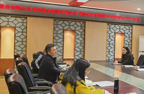 随后重庆航天信息有限公司副总经理邓迅、杨斌分别介绍了重庆航信助力政务治理、助务企业发展的两个业务方向,在智慧政务、信息技术创新、密码应用、区块链、云平台建设、大数据平台等方面的能力建设。双方共同围绕三个方面开展深入探讨,一是人才培养在大数据、智能化、信息化方面如何进行转型;二是调研产教融合、校企合作需求,探讨合作模式;三是现代学徒制、教师企业流动站、双师基地、创新基地等相关项目的落地执行交流。