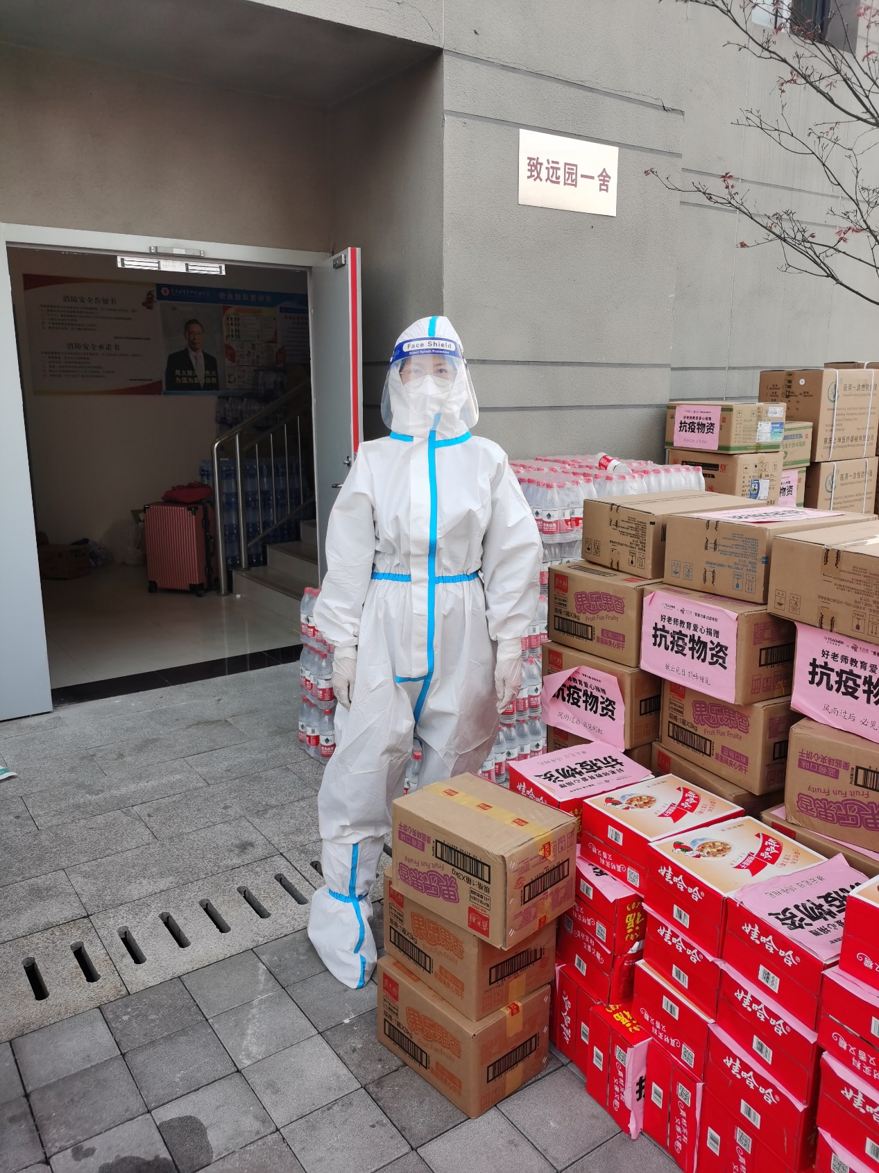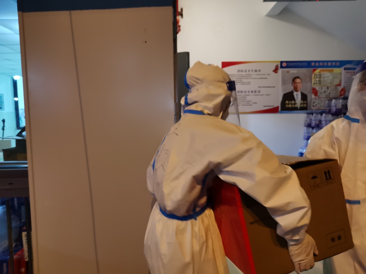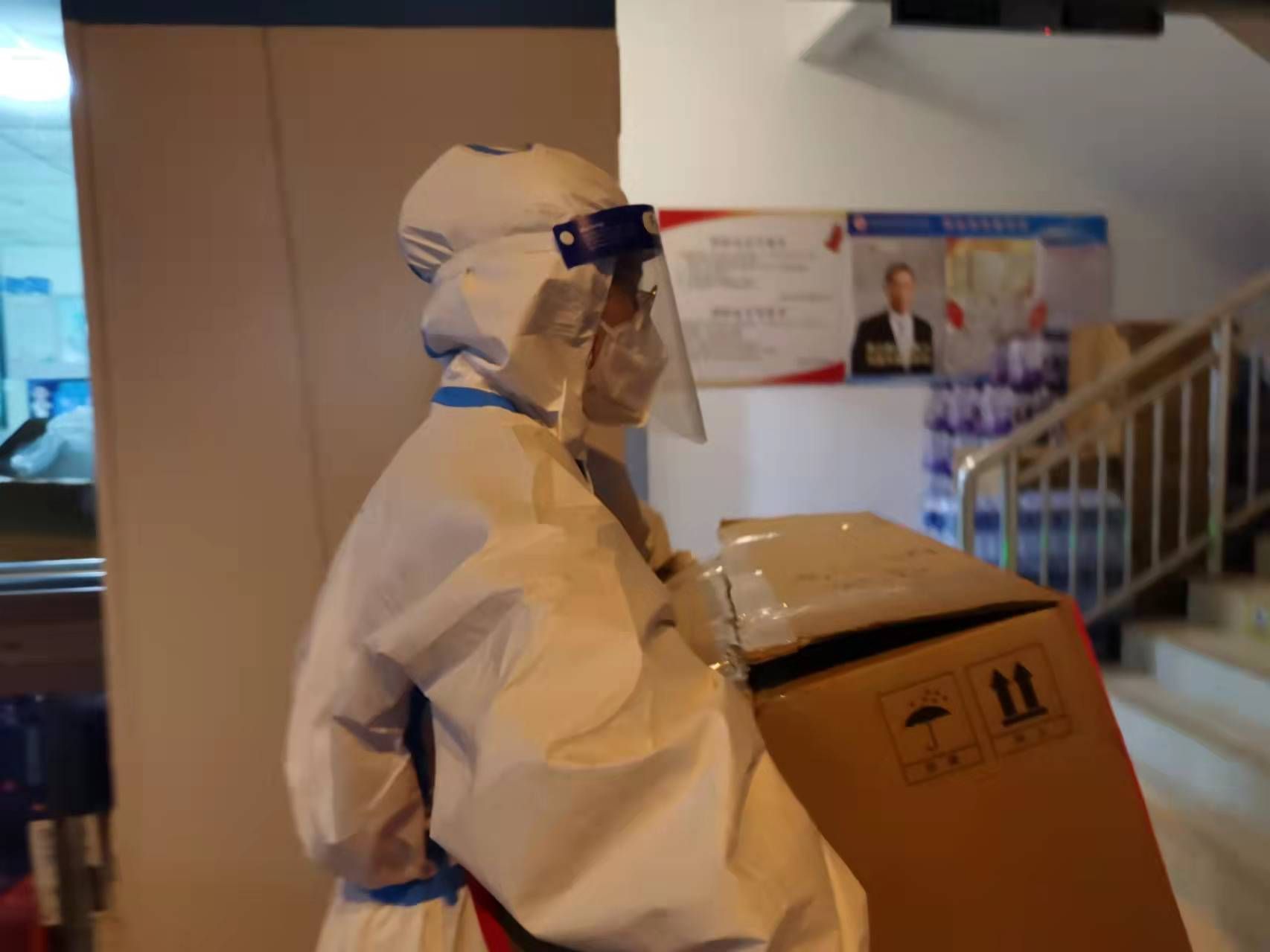 她白天搬运物资,穿着隔离服到学生宿舍分发餐食、水果、饮用水、药品、生活用品及其他所需的物品,照顾因工作被滞留在学院3个企业8
