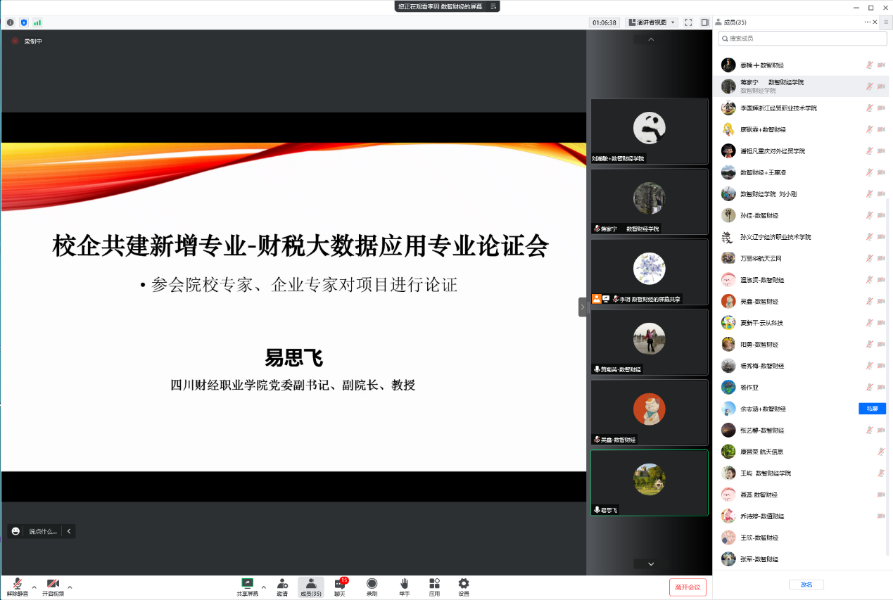 易思飞教授进行点评,强调新增专业的申报符合学院财经应用型人才培养定位,将学院特色和专业未来发展相结合,在专业结构调整布局对接产业链、创新链的同时,应关注当前大类招生模式变化对专业设置带来的影响,时刻关注产业发展变化趋势和区域经济对人才培养的新需求。孙义教授提出两点要求:一是要处理好专业建设中数量与质量的关系,国家双高专业群里一般是由四到五个专业组成,申报该专业使专业群逻辑结构更趋合理,非常有必要;二是需结合区域经济发展方向,企业面临数字化转型,从数字经济发展角度新增该专业非常有必要。随后,李国辉等多位专家从人才培养目标、专业群建设、赋能地方经济发展等方面提出建议,对新增财税大数据应用专业申报表示肯定和支持。