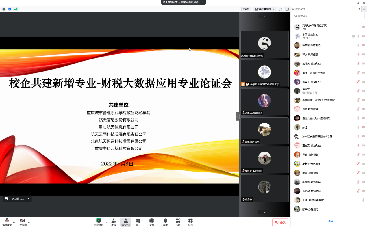 7月3日,数智财经学院召开2022年度校企共建新增专业-财税大数据应用专业论证会,特邀四川财经职业学院党委副书记、副院长易思飞,辽宁经济职业技术学院商贸学院院长、教授级高级工程师孙义,浙江经贸职业技术学院财务会计学院党总支书记、院长李国辉,重庆对外经贸学院经济学系系主任潘祖凡,合作单位航天信息股份有限公司1+X产教技术总监康晋荣、教学资源部经理郭悦,航天云网科技发展有限公司市场总监万丽华,重庆中科云从科技有限公司西南区金融事业部负责人夏新平出席会议对项目进行论证。学院党总支书记蒋家宁、副院长黄菊英(主持工作)、党总支副书记刘小刚、副院长黄倩、教学办公室主任李玥、各专业带头人、教研主任及教师代表参加会议。会议由黄菊英副院长主持。