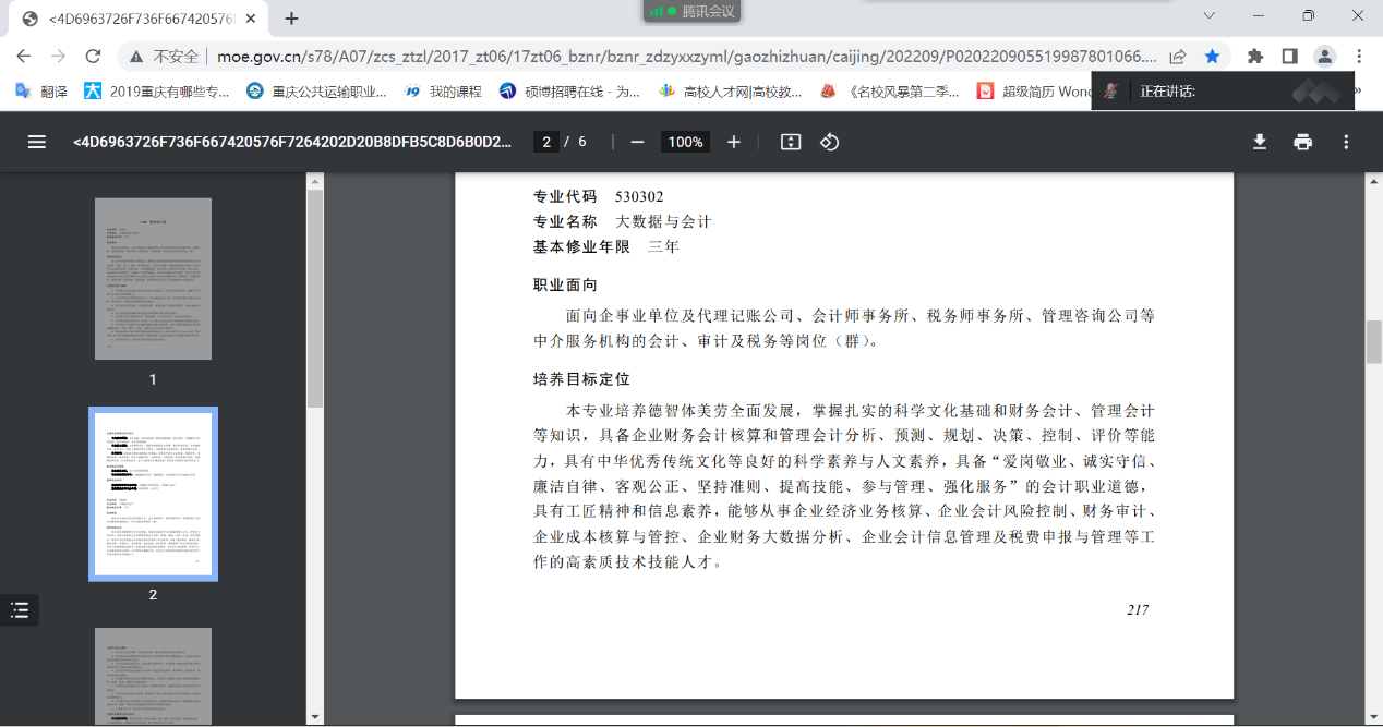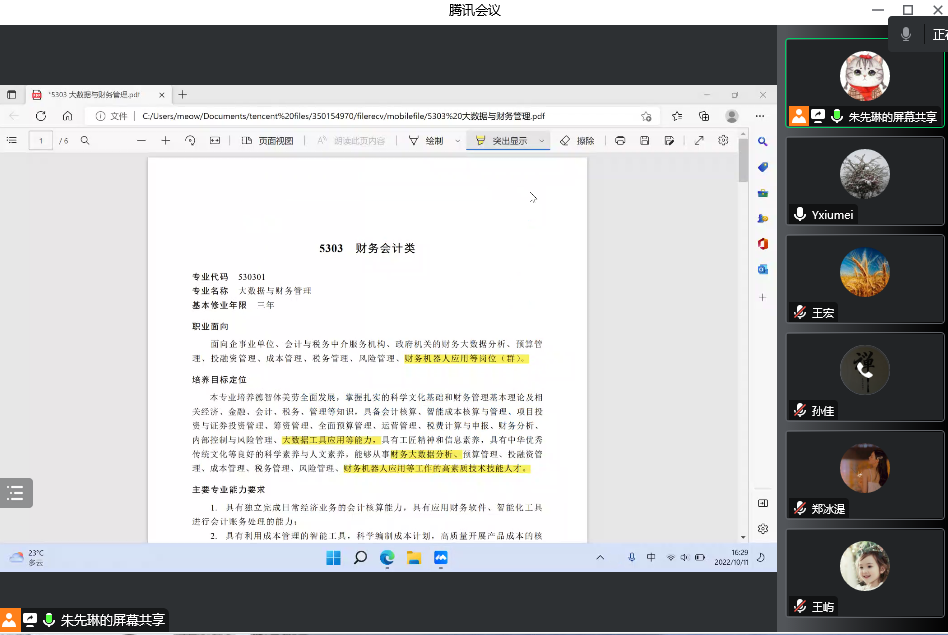 大数据与财务管理专业、金融服务与管理专业于10月11日组织召开职业教育新专业简介线上学习交流会,分别由专业带头人杨秀梅、专业带头人兼金融党支部书记王惠凌、教研室主任朱先琳主持;大数据与会计专业于10月18日开展学习新职业教育专业简介的线上教研活动,会议由教研室主任阳勇主持、教研室主任助理吴鑫主讲。三个专业分别就专业代码、专业名称、基本修业年限、职业面向、培养目标定位、主要专业能力要求、主要专业课程与实习实训、职业类证书举例、接续专业举例等内容开展深度交流与学习。
