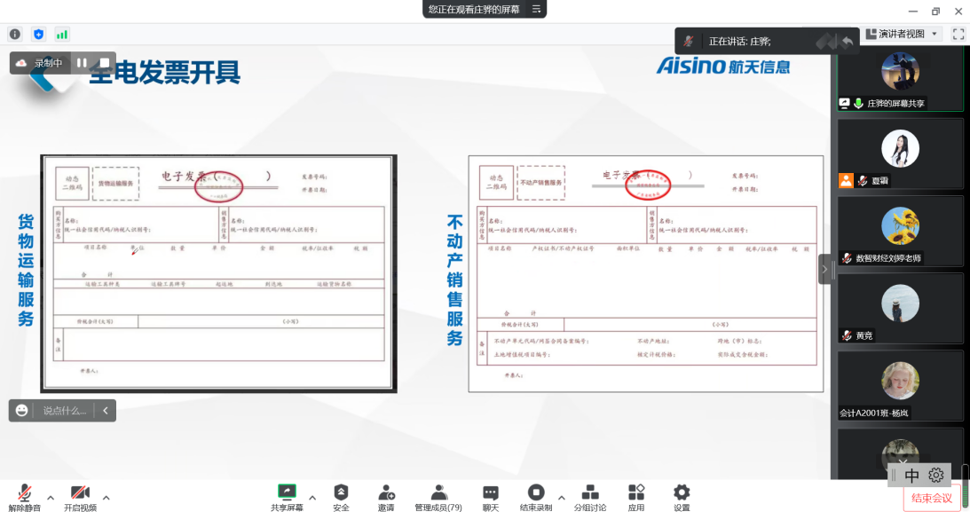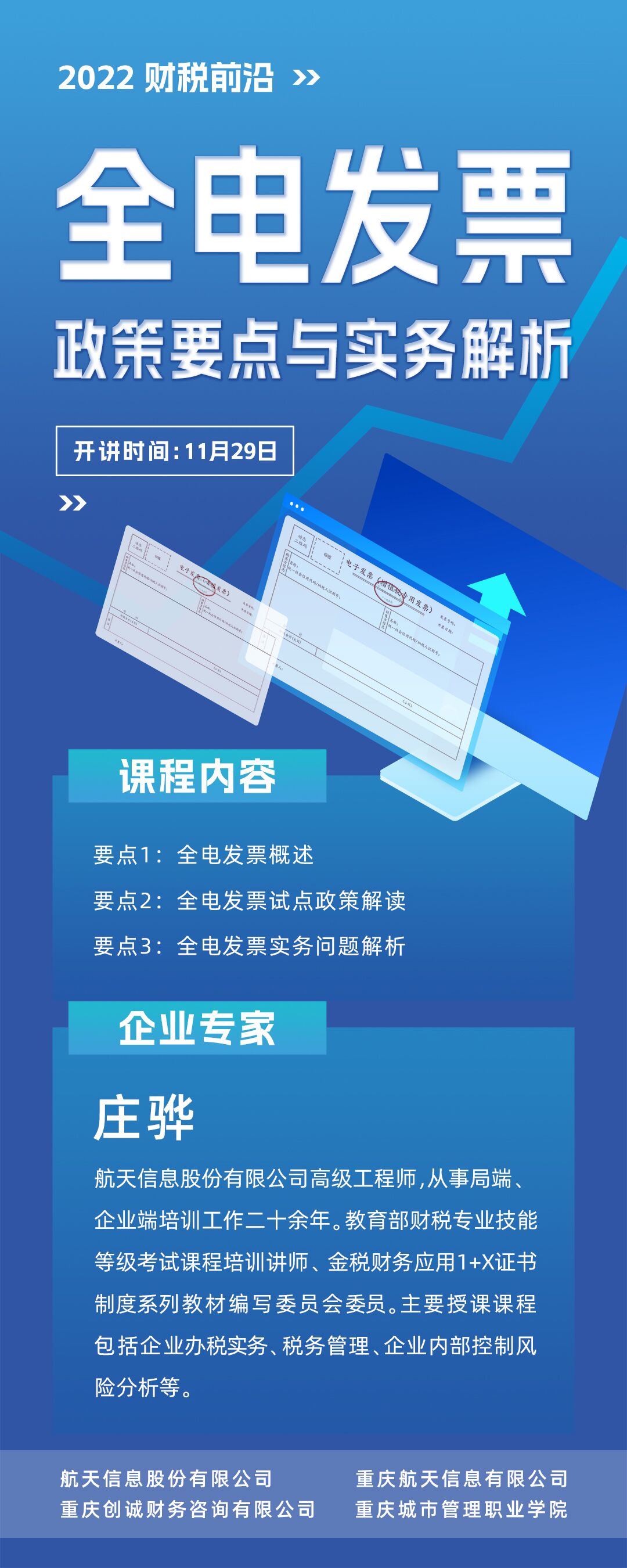 11月29日,数智财经学院与航天信息股份有限公司、重庆航天信息有限公司、重庆创诚财务咨询有限公司联合举办了一场前沿技能提升专题讲座——”全电发票政策要点与实务解析”。主讲人庄骅,长期从事国家税务局、全国大中型企业财务总监培训的航天信息股份有限公司高级工程师,同时也是教育部财税专业技能等级考试课程培训讲师,通过腾讯会议为学院师生开展了”全电发票政策要点与实务解析”专题讲座,学院全体专任教师和部分学生代表共计100余人参加讲座。
