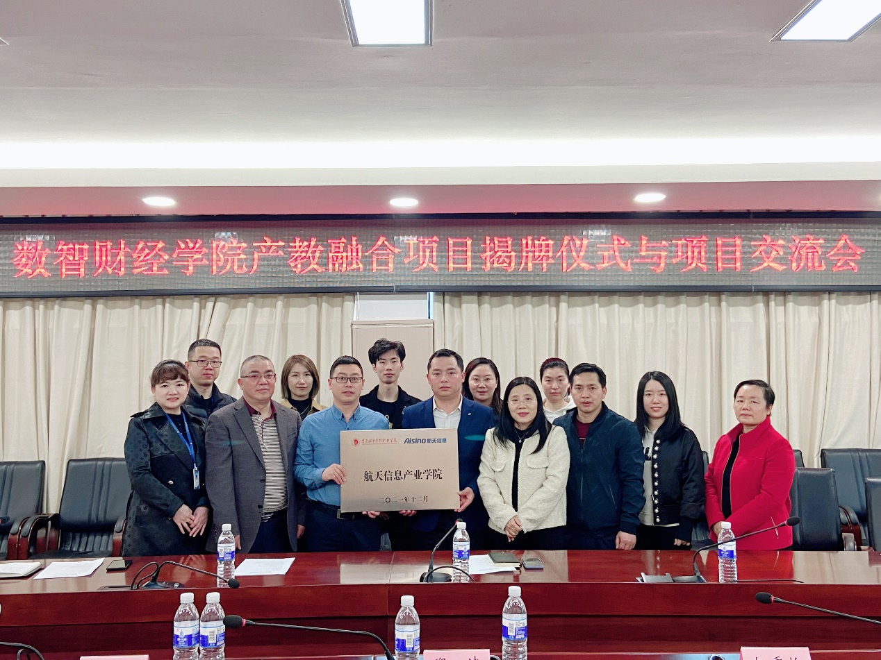 3月22日,重庆城市管理职业学院航天信息产业学院揭牌仪式在办公楼201会议室举行。航天信息股份有限公司代表郑波经理,重庆航天信息股份有限公司代表杨星专员,重庆城市管理职业学院产教融合中心王强科长,数智财经学院党政领导班子全体成员、数智财经学院教学事务办公室人员,学院专业带头人和教研室主任,及航天信息产业学院工作组全体人员等20余人参加仪式。