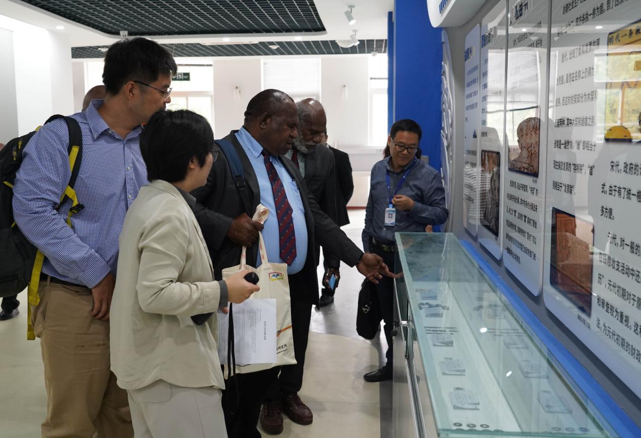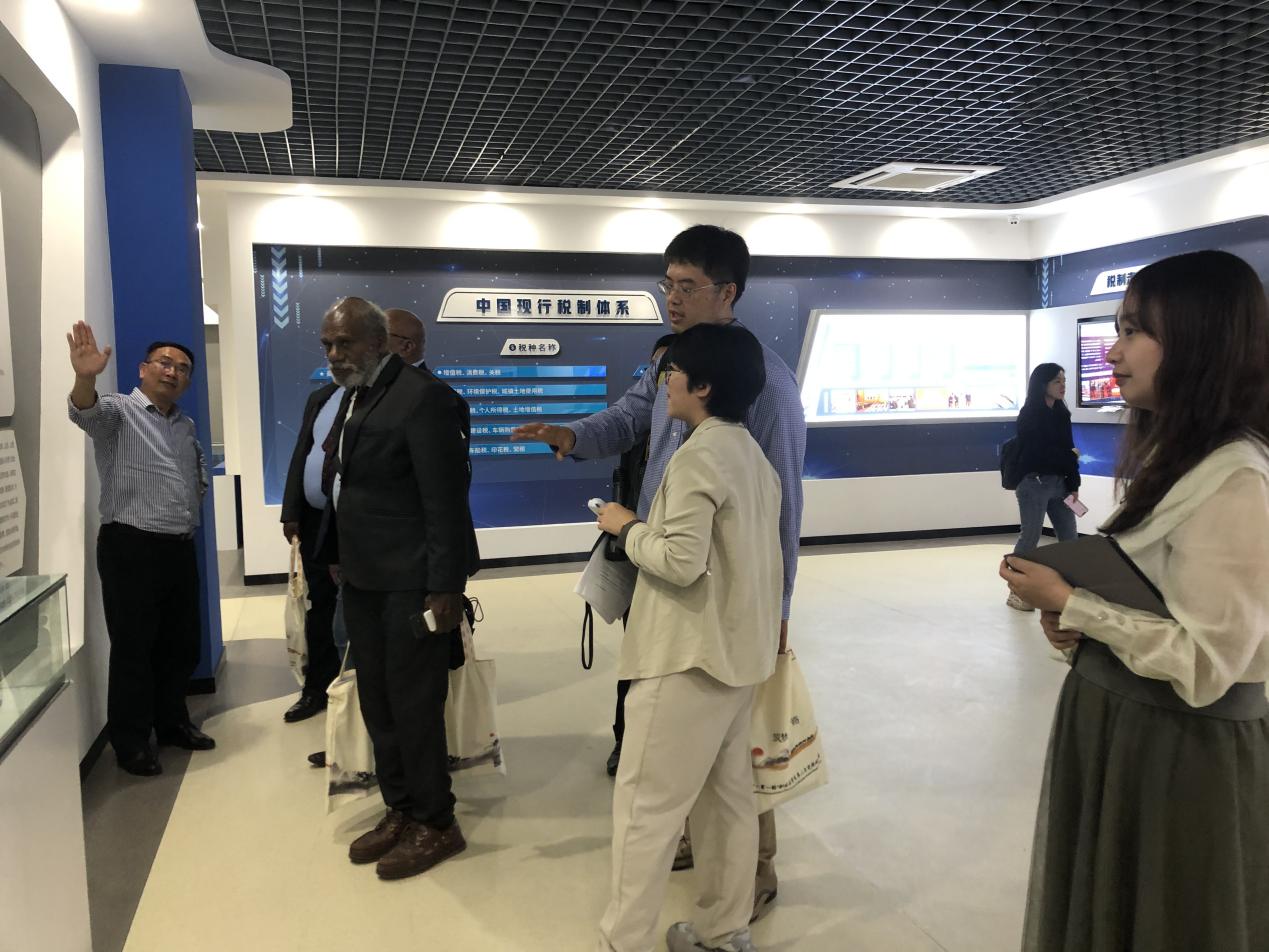 4月14日,巴布亚新几内亚科技大学行政副校长考尔·吉纳先生、巴布亚新几内亚环境与自然资源大学校长蒲喂先生、巴布亚新几内亚科技大学孔子学院中方院长张显先生、巴布亚新几内亚科技大学孔子学院外方院长大卫·陈先生、布图卡学园理事会理事长阿普瓦先生、重庆师范大学国际汉语文化学院教师程涛等一行参观我院金税文化馆,国际合作与交流中心主任孙玉中等陪同参观。