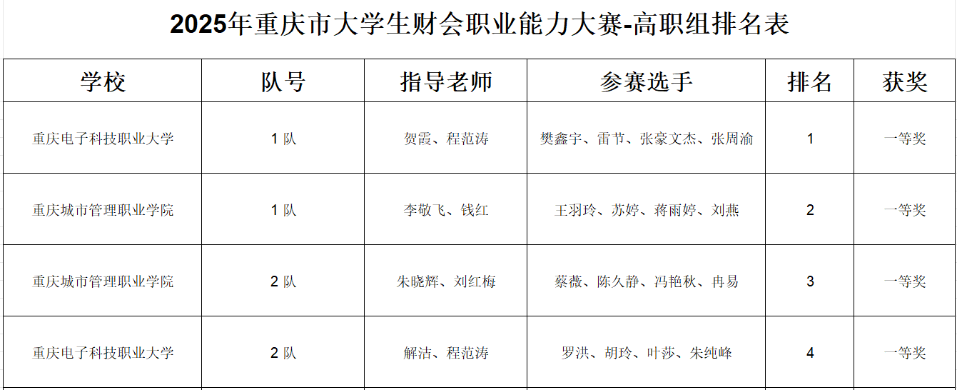 10月18日,由重庆市教育委员会主办,重庆工商大学等单位联合承办的重庆市大学生财会职业能力大赛在重庆工商大学隆重举行。我院大数据与会计专业派出的两支参赛团队——1队(王羽玲、苏婷、蒋雨婷、刘燕)和2队(蔡薇、陈久静、冯艳秋、冉易)凭借出色表现,双双荣获高职组一等奖,展现了我院在数智财经人才培养方面的显著成效。