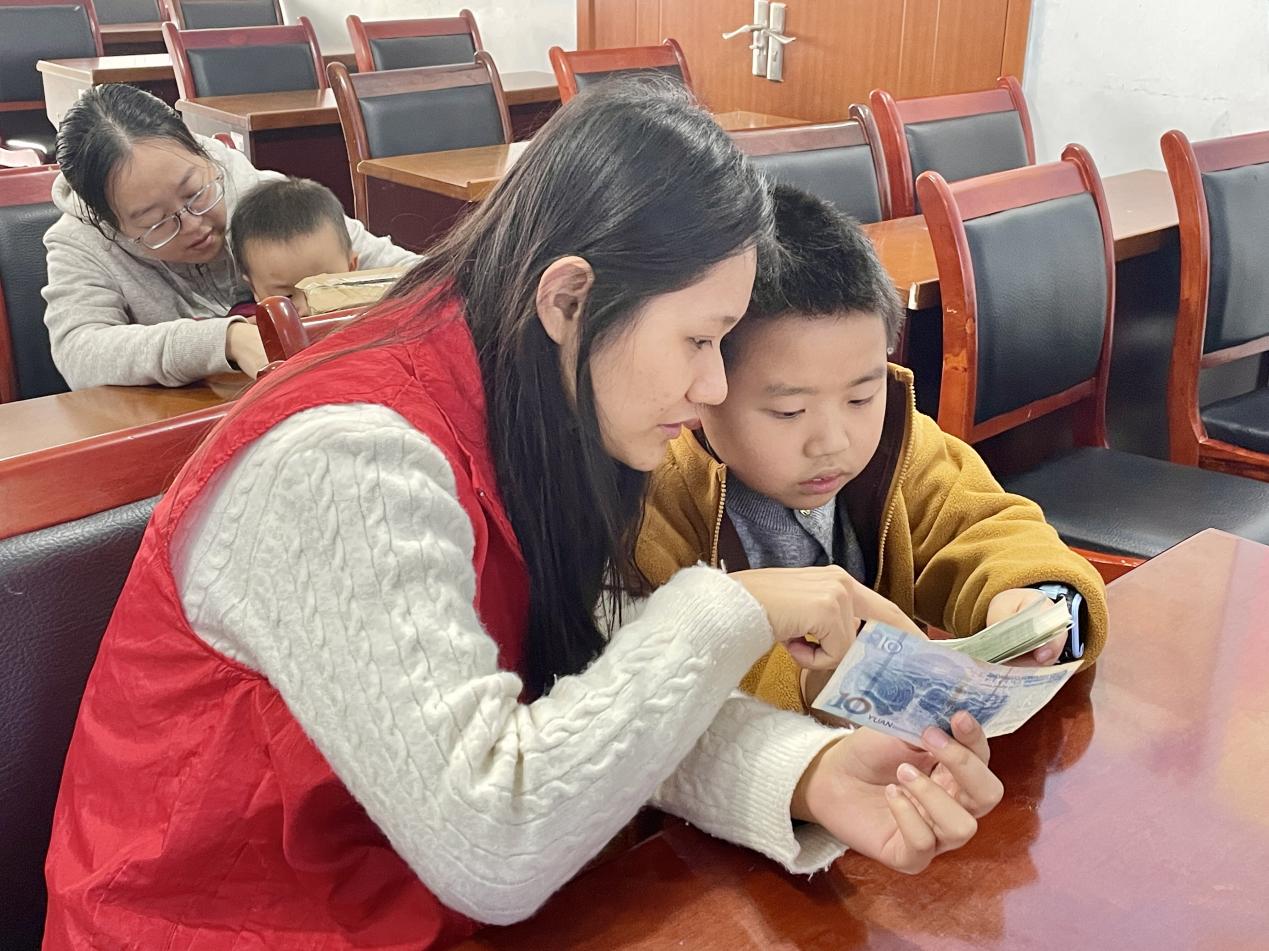 活动当天,志愿服务队伍再次学习活动纪律和明确职责分工,细心清点筹备的真假钞样本、防诈骗宣传手册、互动抢答奖品等物资,随后整齐有序地奔赴虎兴社区。随着最后一位小朋友落座,活动正式拉开帷幕。“大家看,这样单指单张点钞又快又准!”志愿者们率先展示了单指单张、多指多张等专业点钞手法,指尖翻飞间,钞票快速清点完毕,引得现场小朋友们阵阵惊叹,纷纷好奇地探头围观。随后,志愿者们拿出真假钞实物样本,通过“触摸票面凹凸感”“观察水印清晰度”“透光查看安全线” 等直观方法,用通俗易懂的语言逐一讲解鉴别技巧,还让小朋友们亲手触摸对比,帮助大家快速掌握真假钞识别的核心要点。
