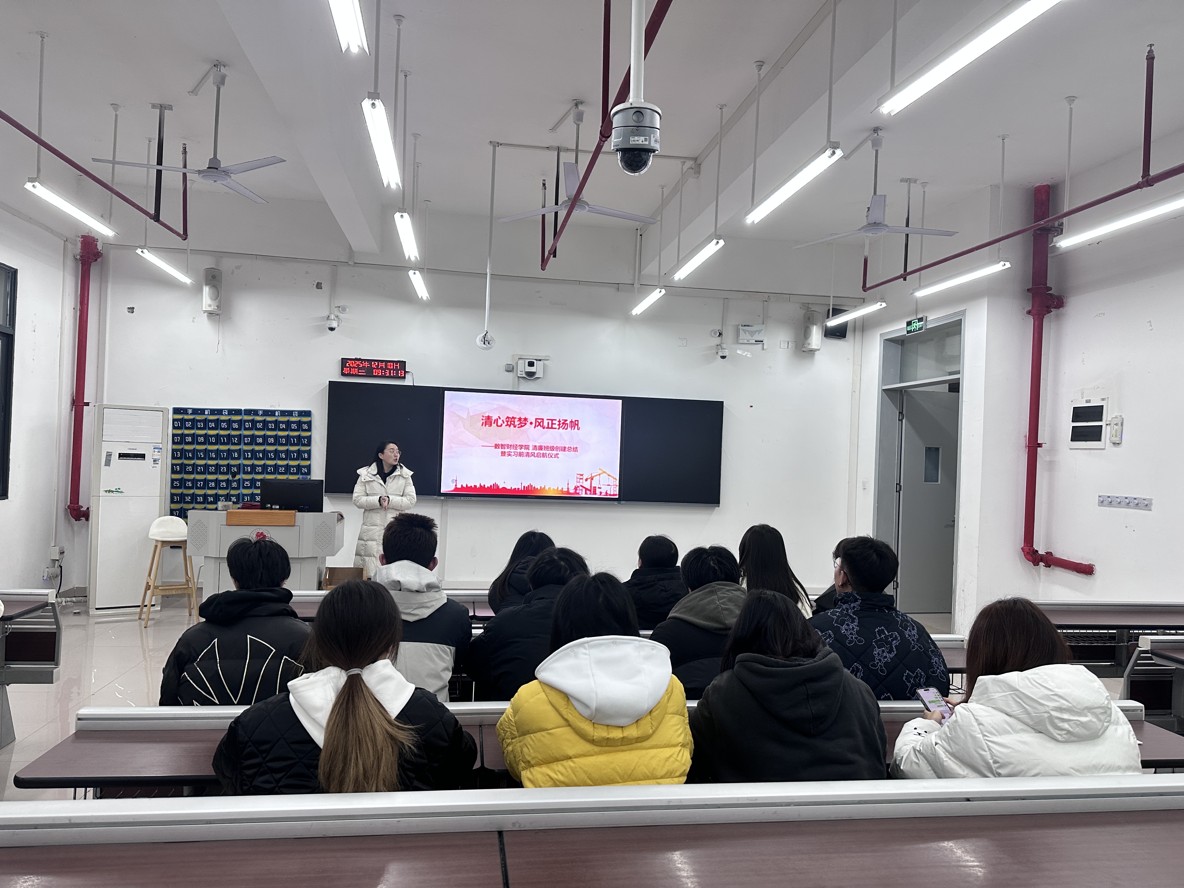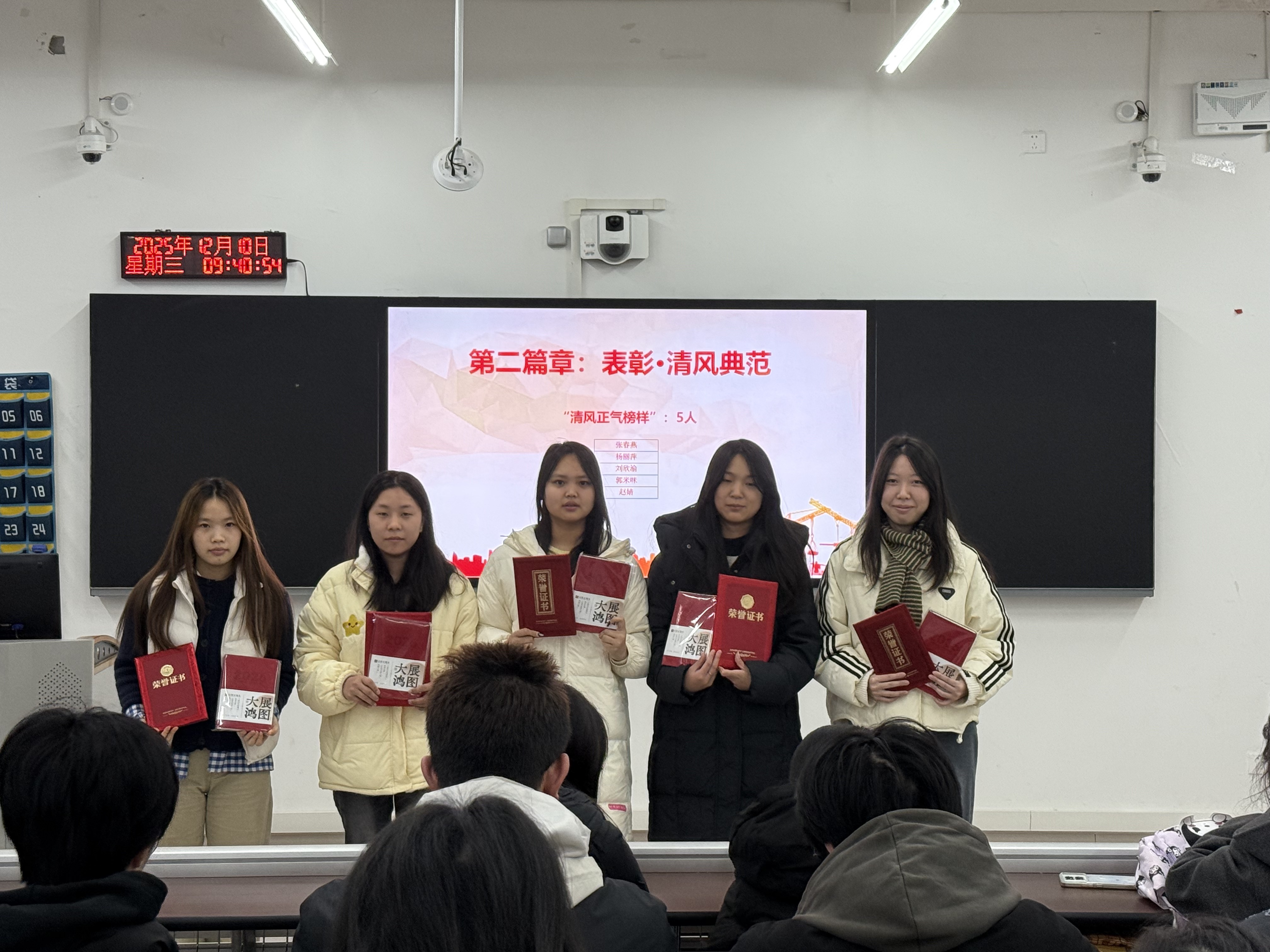 为深化清廉班级建设成果,强化学生廉洁从业意识,引导同学们在步入实习岗位之际筑牢思想防线,我院清廉班级财务A2302班于12月10日在致用楼C101举办“清心筑梦,风正扬帆——清廉班级创建总结暨岗位实习清风启航”主题活动。班级全体同学、辅导员老师、院系学生会骨干共同参与了本次活动。