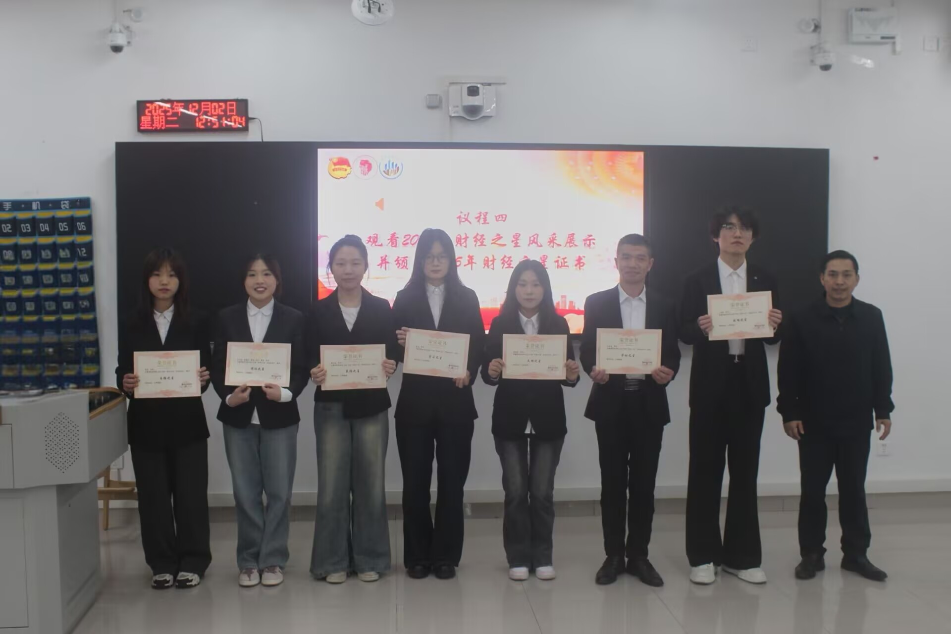 星光不负赶路人,榜样引领新征程。为发挥优秀学子的示范引领作用,大会现场播放了2025年财经之星风采展示视频,优秀学子的成长故事与奋斗身影催人奋进,为在场同学树立了鲜明的榜样标杆。刘小刚副书记为财经之星代表颁发荣誉证书,并激励全体学子以榜样为镜、向优秀看齐,在青春的赛道上奋勇争先、逐梦前行。