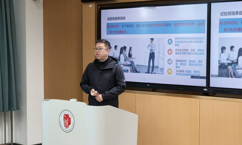 在动员环节后,大数据与会计专业建设负责人邹博宇详细介绍了2025级数智试验班在教学改革、课程设置和人才培养目标等方面的基本情况,并对2025级数智试验班选拔的流程和条件做了说明。