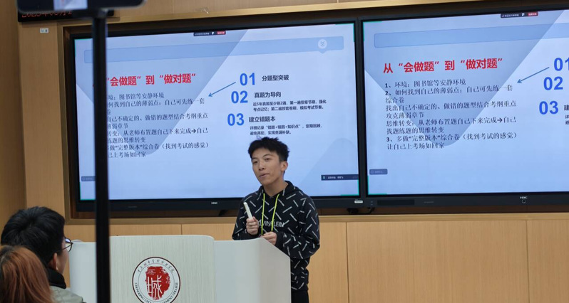 随后,2024级数智试验班的两名学生代表冉易和尤梓鉴为参会同学分享了参与技能竞赛和备考相关证书的宝贵经验。他们以真实生动的成长故事,激励学弟学妹积极投身数智化学习赛道,在实践中淬炼本领、在竞赛中磨砺技能。