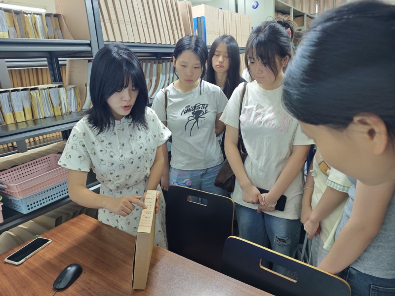 最后,同学们在档案管理员的带领下,步入了档案的“家园”——实体库房。恒温恒湿的环境、完备的“八防”设施与林立的密集架,让书本上的档案保管要求有了具象化的呈现。管理员深入浅出地讲解了档案原件的排架规则、保护要求与库房管理制度,并展示了部分珍贵档案的复制件,让同学们在厚重的历史质感中,深刻理解了“实体保管是数字化的根基,二者共同构成了档案保护与利用的完整生态”这一理念。