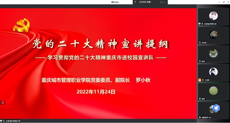 为深入学习贯彻党的二十大精神,根据学校党委统一安排,11月24日,学校党的二十大精神宣讲队成员,学校党委委员、副校长罗小秋通过腾讯会议为大数据与信息产业学院全体教职工进行党的二十大精神专题宣讲。大数据与信息产业学院党总支书记董勇主持会议。