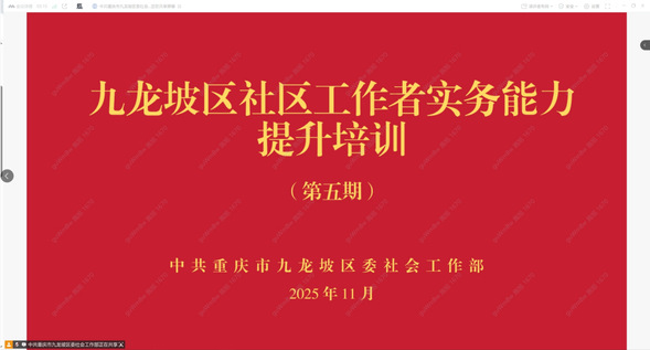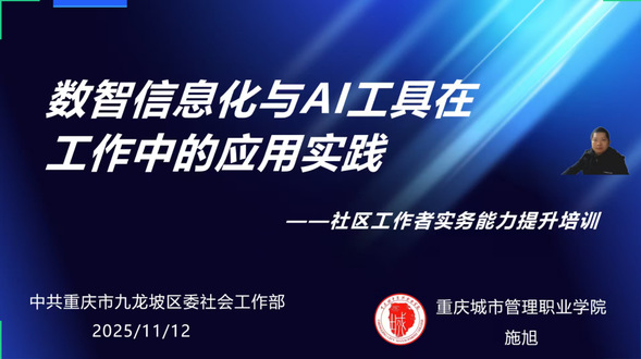 11月12日,重庆市九龙坡区社区工作者实务能力提升培训(第五期)顺利开展,学院软件技术专业教研室教师施旭受九龙坡区委社会工作部委托,以“数智信息化与AI在工作中的应用实践”为题为九龙坡区当地20多个街道和社区约100名基层工作人员开展了线上专题授课,为参训社区工作者带来了一场兼具理论高度与实操价值的技能培训。