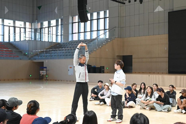 活动第一个环节的主题是悦享文化。通识学院车坦老师简要介绍了气功的定义,强调“气(生命能量)”的流动。然后在他的带领下70余名学生学习了气功——八段锦,同学们认真听讲,跟着老师的动作学习,其动作舒缓如锦缎般柔顺。学生们通过“气”的概念了解了中医哲学,体验了动作中的阴阳平衡,理解了东方“身心一体”的思想理念以及中国传统和谐观。
