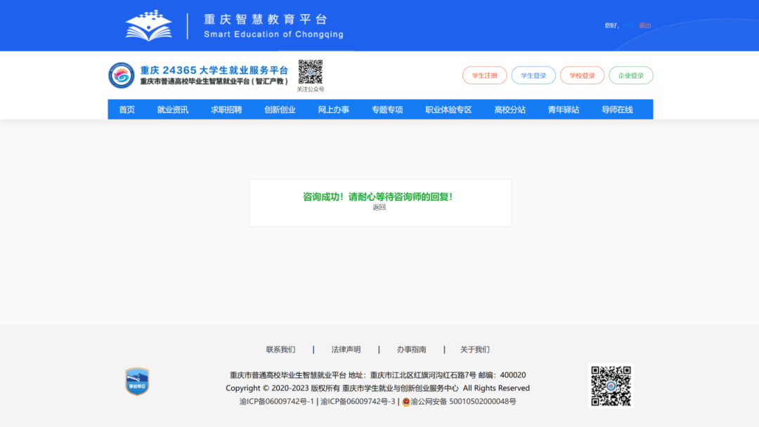 页面提示“咨询成功”后,咨询师会在48小时内给予回复。如遇节假日或寒暑假,回复时间可能延长至7天内。