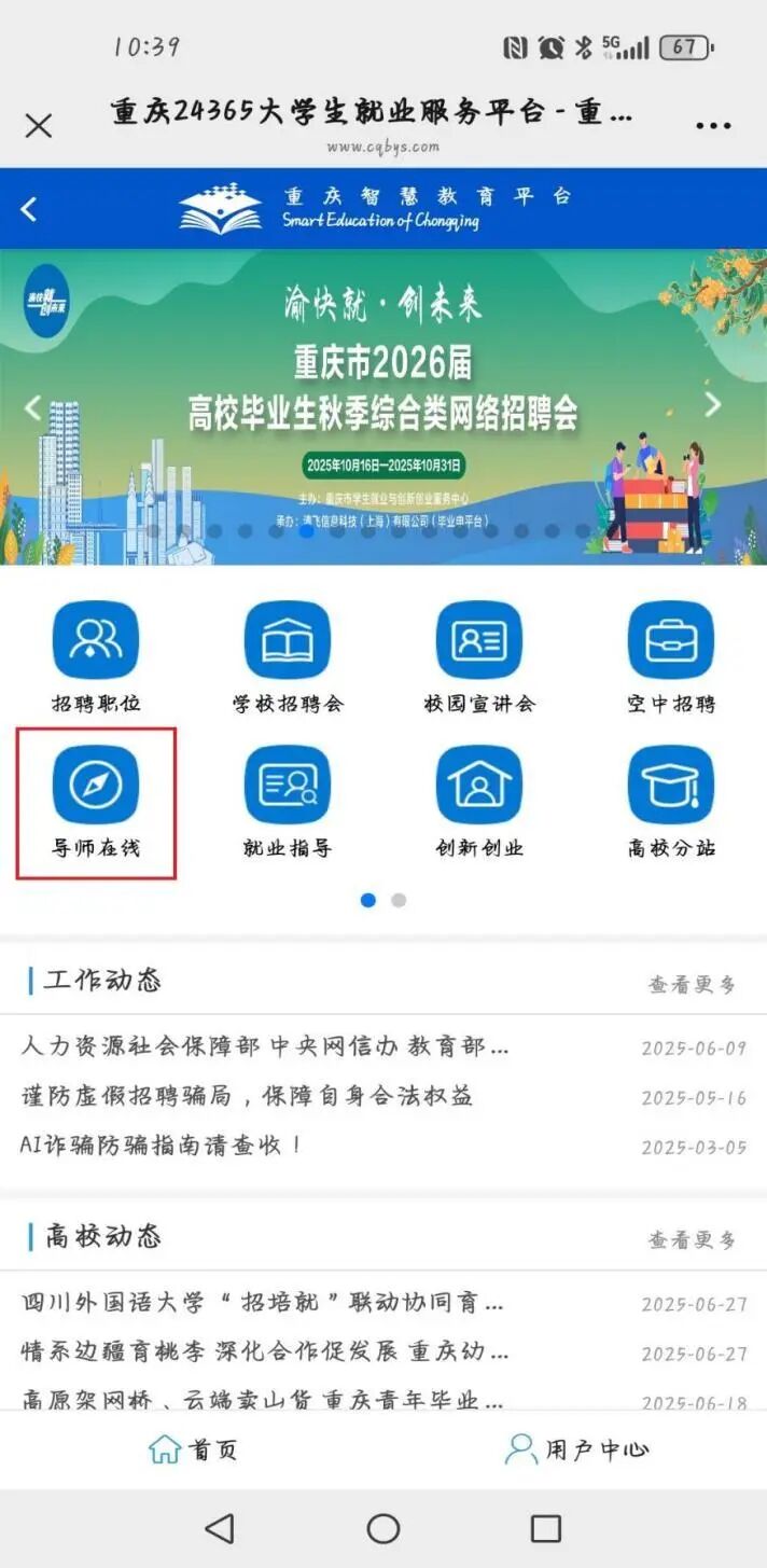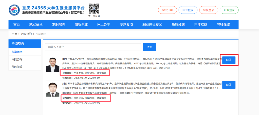 进入“重庆24365大学生就业服务平台”,找到 “导师在线” 服务入口。