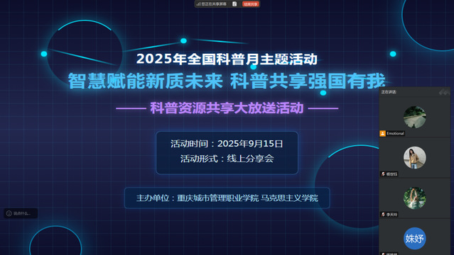 为了积极响应2025年全国科普月的号召,推动科学知识普及与资源共享,马克思主义学院于9月15日开展“智慧赋能新质未来·科普共享强国有我”线上科普资源共享主题活动。