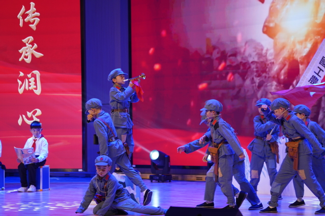 幕一《丰碑》由重庆科学城树人思贤小学的同学们以情景剧形式演绎。该剧幕以红军长征为背景,再现了革命岁月中一位军需处长用生命践行信仰、以牺牲铸就精神丰碑的感人故事,深刻诠释了长征精神的不朽光辉。