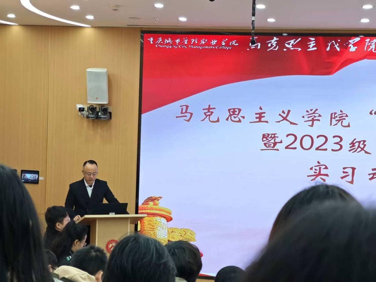 大会在展示 2023 级学生校园生活与成长历程的暖场视频中拉开帷幕。杨飏作实习动员讲话。他强调,专业实习是人才培养的关键环节,是推动理论联系实际、促进知识转化为能力的重要阶段,更是锤炼党性修养、提升政治素养与专业技能的重要契机。同时,他对全体实习学生提出明确要求:一要端正态度,深刻认识实习教学的政治意义与实践价值;二要勤学笃行,在实践岗位上积极运用所学理论,提升解决实际问题的能力;三要严守纪律,自觉维护学院与个人形象,展现学院学子的良好风貌。