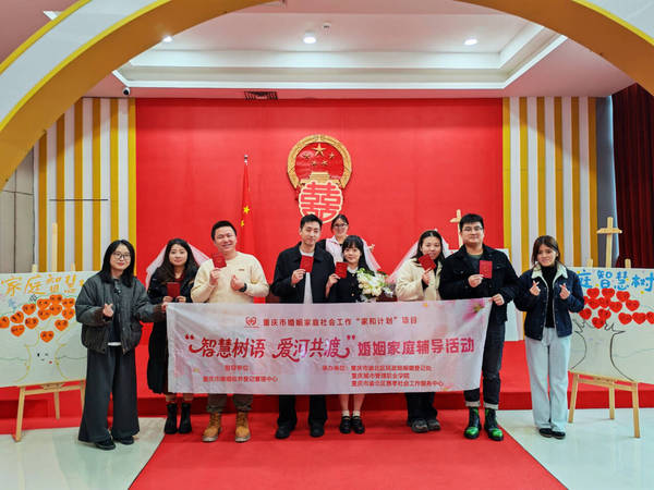 在重庆市婚姻收养登记管理中心(重庆市未成年人保护中心)的指导下,11月18日上午,民政专业党支部婚庆服务与管理专业党员教师来到重庆市渝北区民政局婚姻登记处,与重庆市渝北区慈孝社会工作服务中心联合开展了“智慧树语,爱河共渡”婚姻家庭辅导活动。