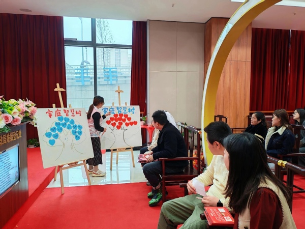 当天在登记处登记结婚的新人兴致勃勃地参加了本次活动。活动开始,主持人用“婚姻是合作公司还是浪漫旅程?”提问引发新人思考,简述活动流程与目标;随后进行的“情感账户存取”破冰游戏,教师通过发放“爱心便签”,引导新婚夫妻写下近期对伴侣的感激或歉意,现场交换并朗读,增进了新人的情感联结;趣味游戏“家庭拼图”,通过发放与家庭组成部分相关的拼图内容,引导新人合作拼出“家庭智慧树”,通过协作拼图理解家庭要素,凝聚共同期待,强化对家庭角色与共同目标的认知。在阵阵欢笑声中,新人代表分享了自己的感受,并拍照留念。