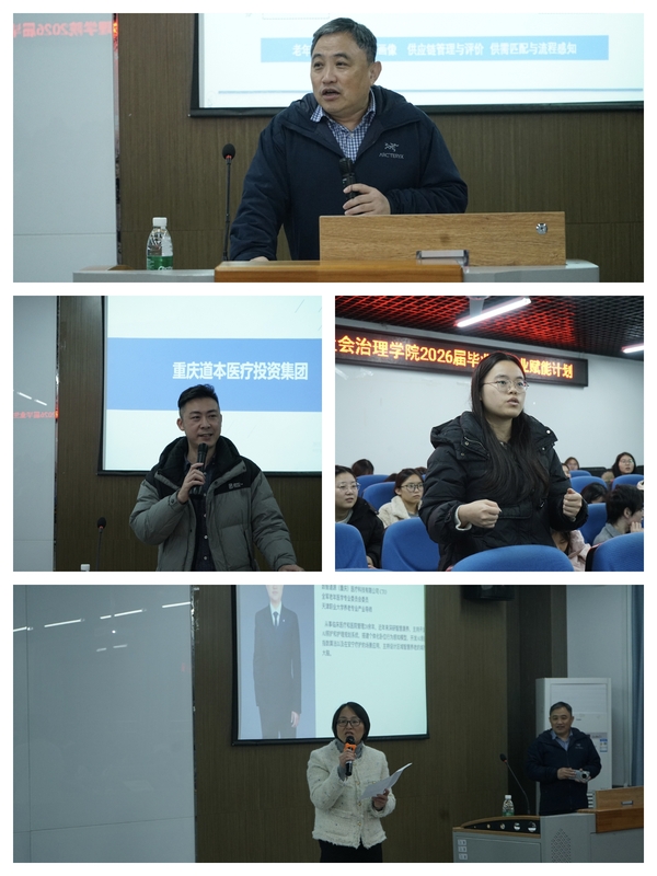 在讲座后的互动环节,中粹人家(重庆)社区养老服务有限公司总经理舒鸿铭开展专题宣讲,介绍企业业务布局并现场发布一批适配岗位,为毕业生提供实习与就业对接通道。