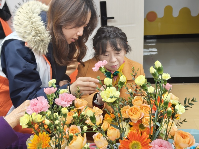 插花环节是活动重头戏。花艺师何老师根据老年群体审美与实操能力,从花材识别、修剪技巧到色彩搭配,耐心讲解并一对一指导。老人们专注实践,现场花香四溢、欢声笑语。创作中,何老师融入关系调适分享,结合插花哲思,引导老人思考人际相处智慧,学习积极倾听、真诚赞美等沟通技巧。