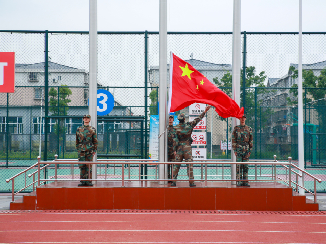 伴随着雄壮的《义勇军进行曲》,五星红旗冉冉升起,全体人员肃立行注目礼,军训总结大会正式拉开帷幕。