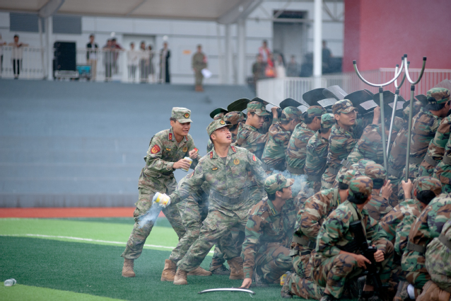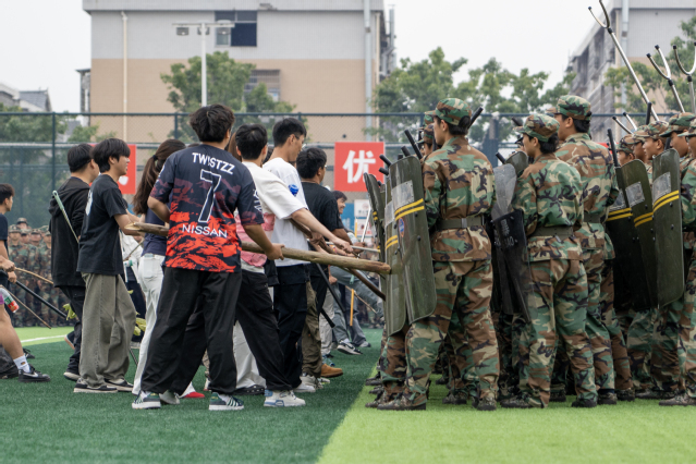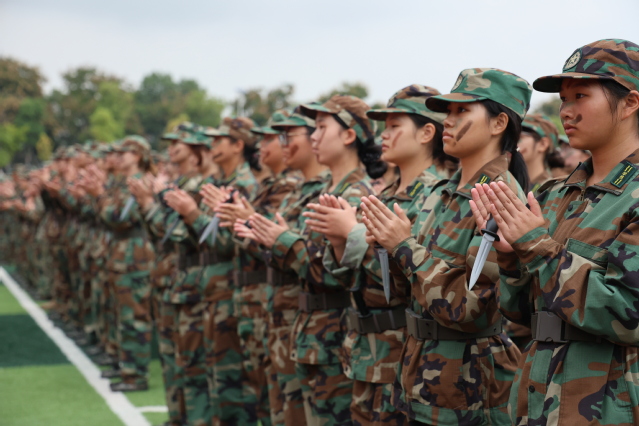 军训结训考核环节精彩纷呈。防爆队训练展示中,队员手持警棍与盾牌,动作规范,劈、戳、撩等警棍动作和顶、挑、挡等盾牌动作熟练运用,攻防转换尽显专业;刺杀操展示环节,女学子军容严整,呐喊声震天,一突一刺间诠释青春热血;军体拳展示时,同学们动作刚劲,出拳带风、踢腿有力,在训练中磨砺出坚韧勇敢的作风。