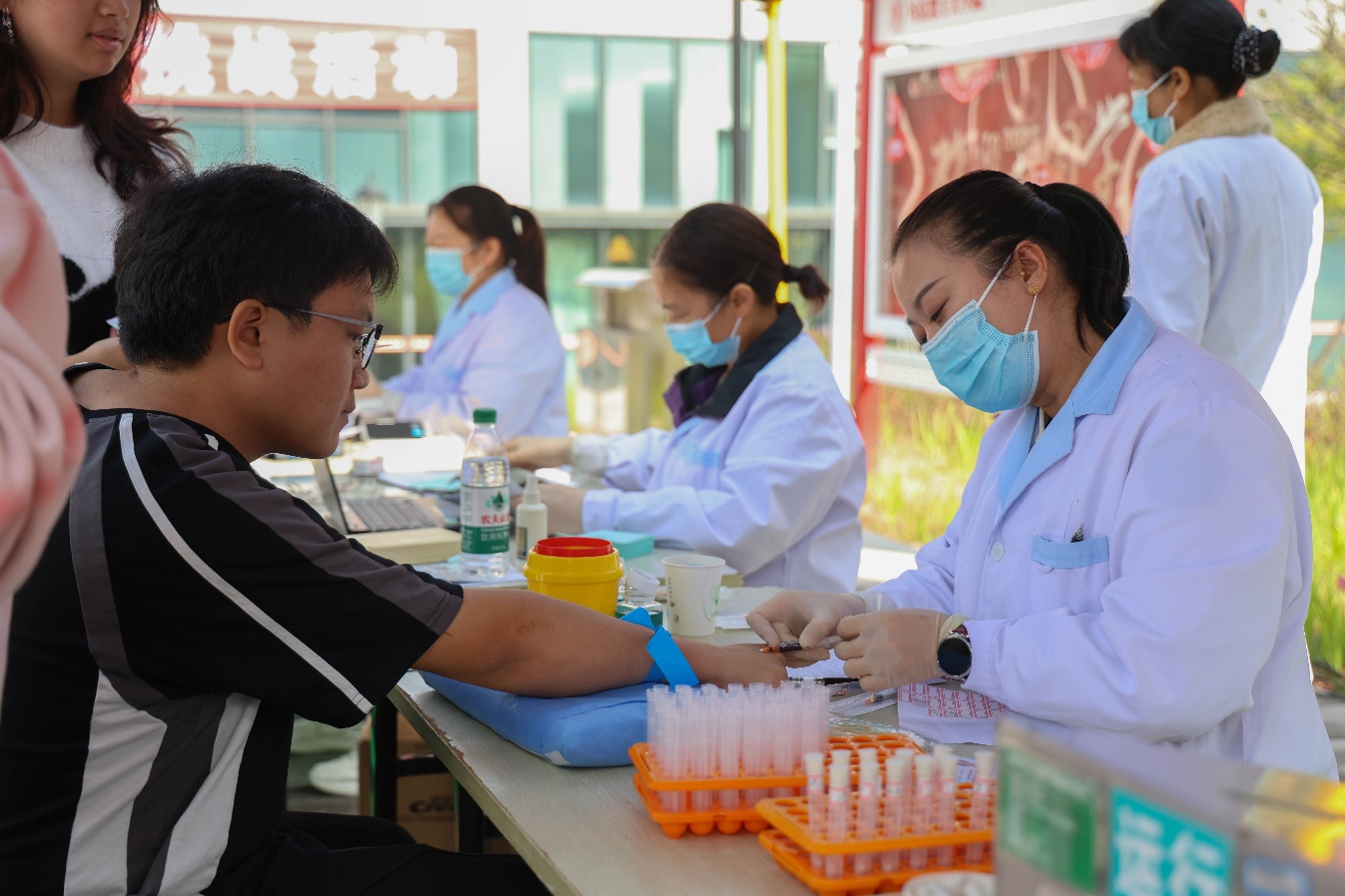 活动正式开展的两天里,青年志愿者化身“公益宣传员”,在校园内人流密集的路口、商业街等设立宣传点,通过分发宣传手册、张贴活动海报以及现场讲解等方式,开展二次宣传和动员。在志愿者的带动下,众多师生纷纷走进献血点,有序排队等候。现场,医护人员与志愿者分工协作,有序引导献血人员完成登记、体检、采血等流程,耐心解答疑问,确保整个过程安全、规范、有序,充分体现了我校对师生生命健康的重视和对公益事业的积极担当。