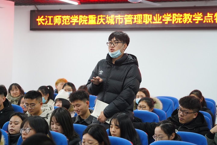 在听取了学生的提问后。向从武院长首先回答了关于学分获取和职业资格证书的问题,向学生们传递了按照人才培养方案要求及时通过各种方式修满学分的必要性和可行性,并根据方案要求和自身条件合理选取合适的职业资格证书等级进行报考。其次,张韵君副院长回答了关于与长江师范学院老师交流和考研复习的问题,向学生们讲授了考研复习的时间安排、报考技巧和自我调节等经验,并承诺在会后会与我校建立面向学生的同两校老师进行交流的平台。接下来,罗文宝副院长就本科阶段竞赛和毕业论文的问题进行了答复,明确表示支持学生组队与长江师范学院本部学生一起参加各类本科竞赛,并向学生介绍了未来一年可参加的竞赛项目。罗院长表示学生在完成毕业论文时,可采取两校老师共同担任指导老师的方式,辅导学生完成论文选题、写作和答辩等环节。最后,唐良友书记代表长江师范学院商学院向学生们表示了问候和关心,希望学生作为两所学校共同培养的第一届物流工程本科专业学生,珍惜并多加利用各项资源,努力学习,作为顺利完成学业并获得成长。