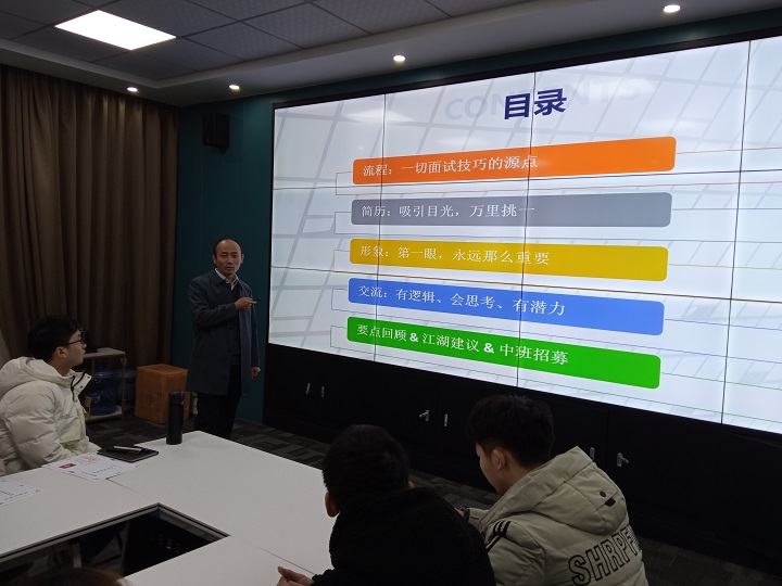 12月27日,商学院在智慧商贸物流大数据中心开展第一期数道数据分析员科研助理第二阶段培训。本次培训的主题为“应届毕业生面试技巧”,由重庆数道科技有限公司的龙泉伟经理主讲。物流管理专业教师安小风、宋伦斌、王雅蕾以及11名科研助理参加了本次培训。