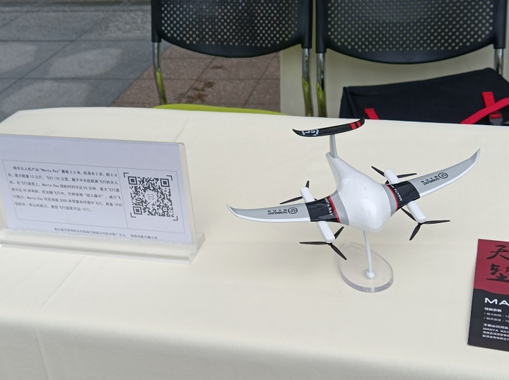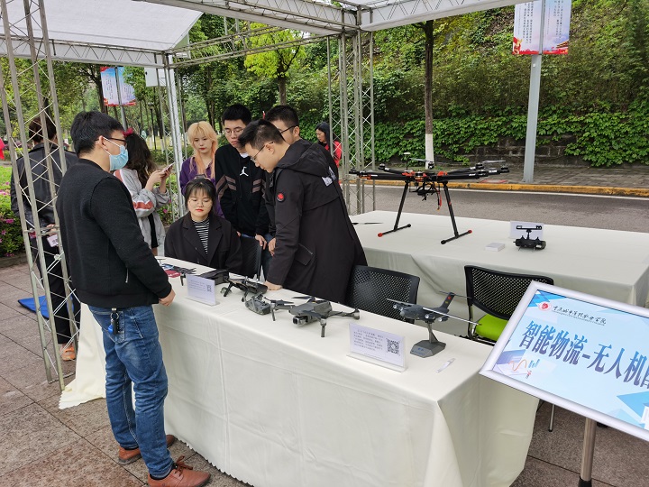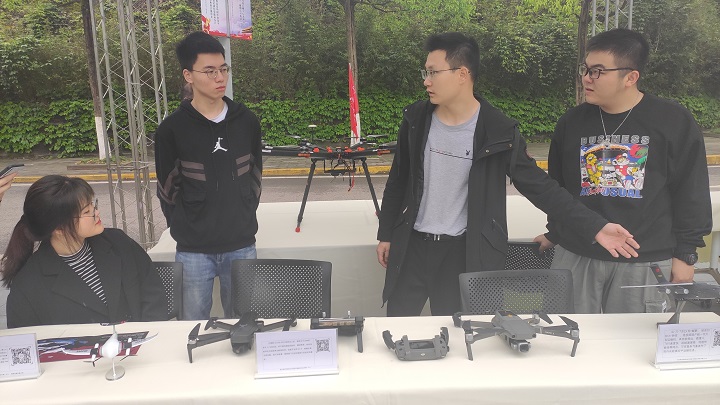 在活动中,指导老师朱光福教授和物流创新兴趣小组的同学为前往参观的市教委领导、学校领导和参会院校老师详细讲解了各种类型无人机的功能和特点,如运20、飞鹰x8、顺丰Manta Ray物流无人机等。重庆无人系统产业联盟技术人员左世闻和物流兴趣小组同学胡文杰、江圣、张敏、田洋、刘照娟、杨玉琳等同学还现场进行了无人机飞行表演。