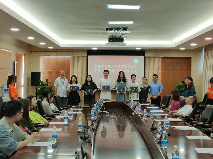 2021年6月27日上午,商学院在办公室二会议室举行了2021届毕业生欢送会。学院科级以上干部、毕业班辅导员、教师代表、2021届优秀学生代表50余人参加,会议由商学院学生事务办公室主任高瑞娟主持。