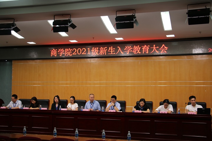 9月13日下午,商学院在学术报告厅举行2021级新生入学教育大会。商学院党总支书记、院长蒋芹忠、党总支副书记唐鸿铃、副院长邱云以及学院科级以上干部、2021级新生辅导员、教研室主任、教师代表、老生代表、2021级全体新生参会。会议由学院党总支副书记唐鸿铃主持。