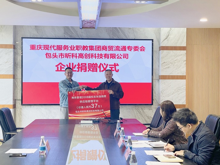 10月21日,重庆现代服务业职教集团商贸流通专委会企业捐赠仪式在我校三会议室成功举行。商学院党总支书记蒋芹忠、商学院副院长邱云、商学院教师代表翁文娟、李昕出席了本次活动。本次企业捐赠与以往不同的是:这是我院首次接受的校友捐赠。该校友为商务管理首届(2008届)学生张强,现为包头市昕科高创科技有限公司总经理,其捐赠的一套供应链管理平台是该公司致力于煤炭运销产业一体化管理研发的拳头产品之一,价值37万余元。该平台目前已安装完毕,并将于本学期投入使用,我院学生能零距离体验真实的企业操作流程。