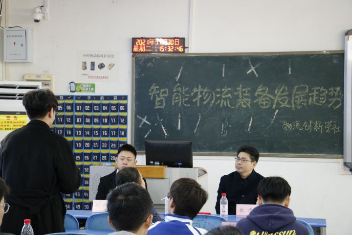 讲座结束时,谢总和袁工还回答了学生代表提出的关于物流机器人的应用、多功能叉车设计、智能物流装备对物色物流发展的贡献等方面的问题。