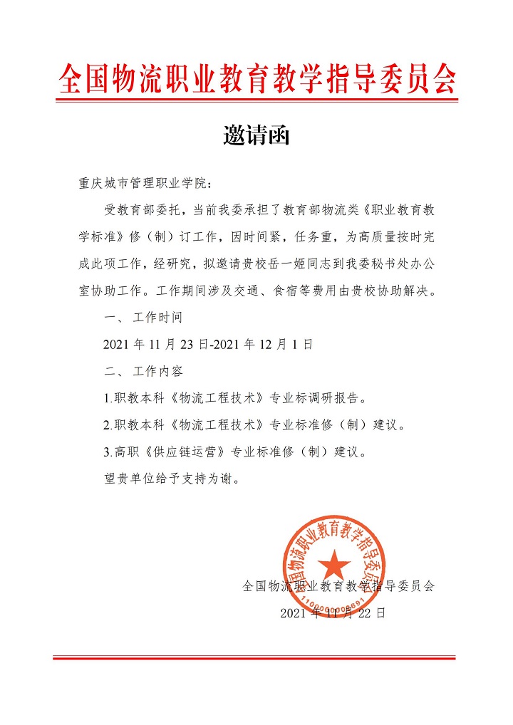 商学院现代物流管理教研室物流工程本科组学科带头人岳一姬老师,受全国物流职业教育教学指导委员会邀请,于2021年11月24日-2021年12月2日赴北京参加教育部《物流类职业教育专业教学标准》制(修)定工作。