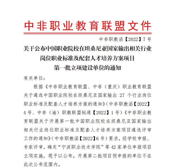 近日,根据《中非职业教育联盟、中非(重庆)职业教育联盟关于遴选中国职业院校在坦桑尼亚国家输出 27 个行业岗位职业标准及配套人才培养方案的通知》,经学校申报、专家评审,我校成功获得《中国职业院校在坦桑尼亚国家输出相关行业岗位职业标准及配套人才培养方案项目第一批立项建设单位》。